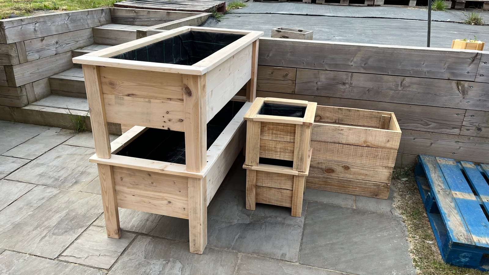 Each planter is handcrafted from reclaimed treated wood, designed to provide strength and durability for outdoor use.