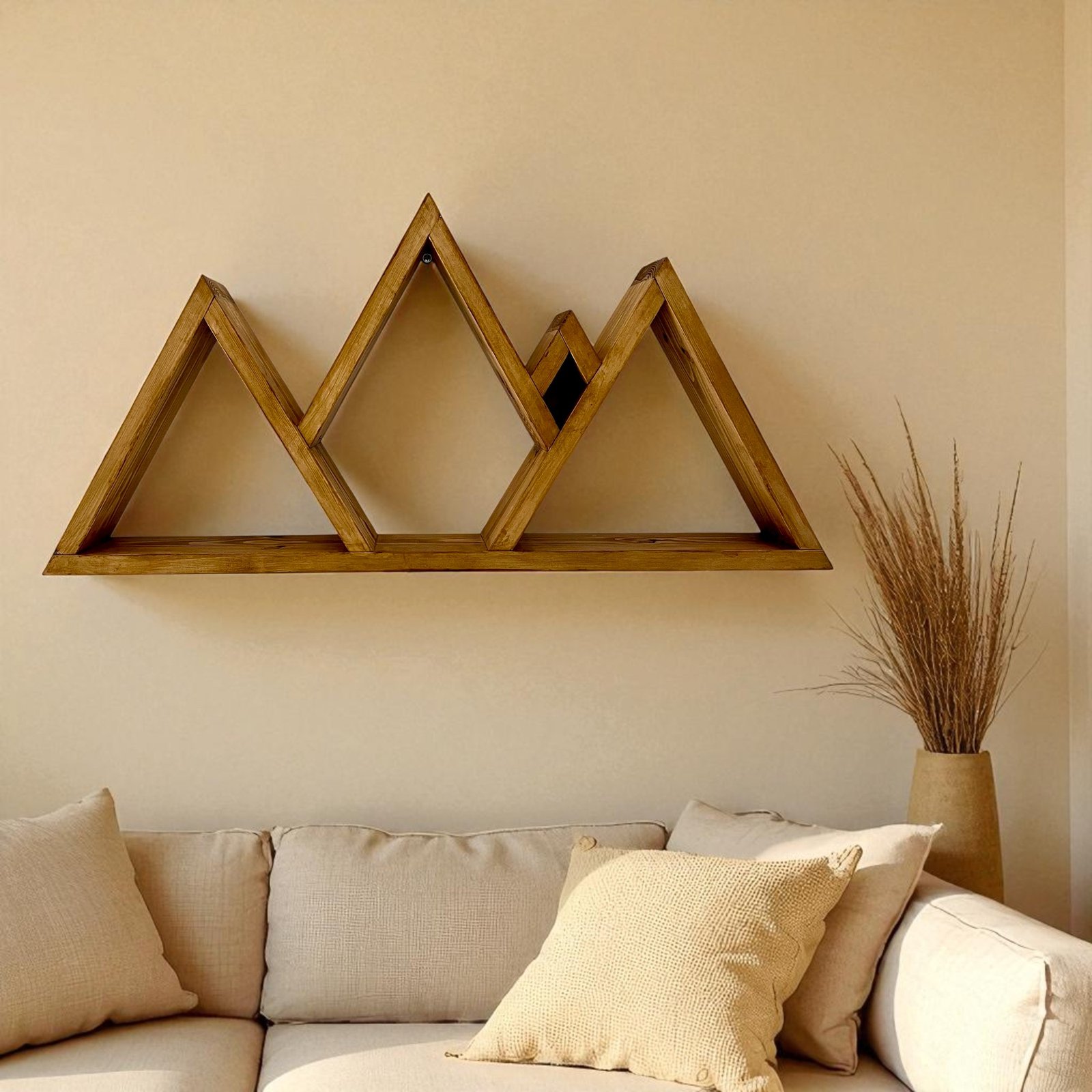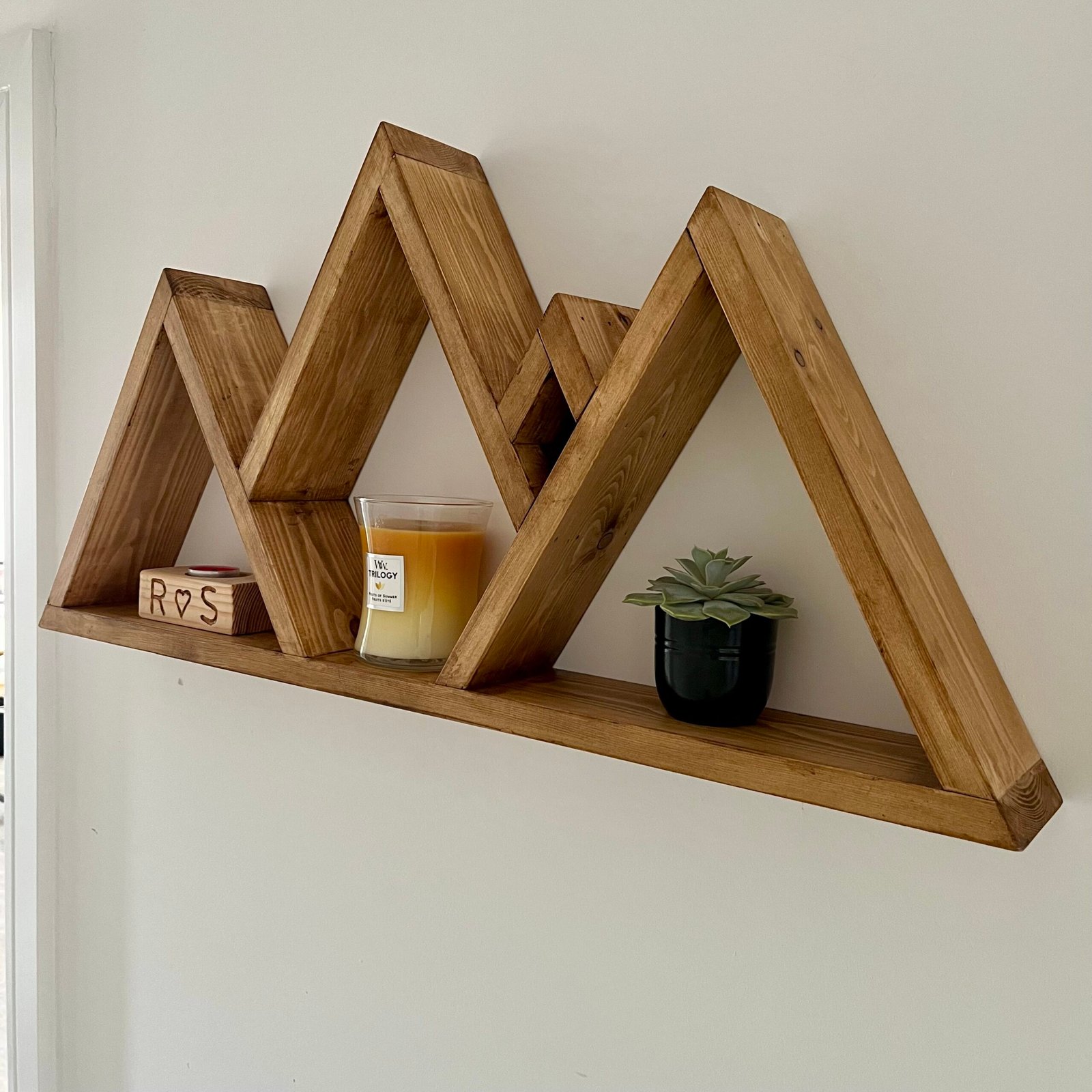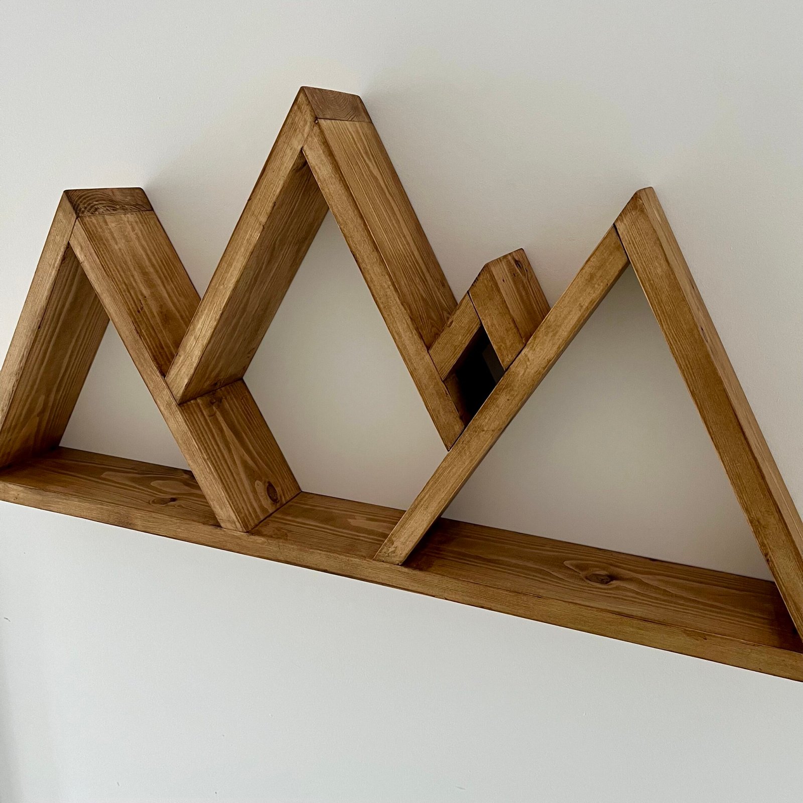 Bring the beauty of the outdoors into your home with this handcrafted wooden mountain shelf. Inspired by mountain landscapes, this unique wall shelf adds rustic charm and natural warmth to any room.