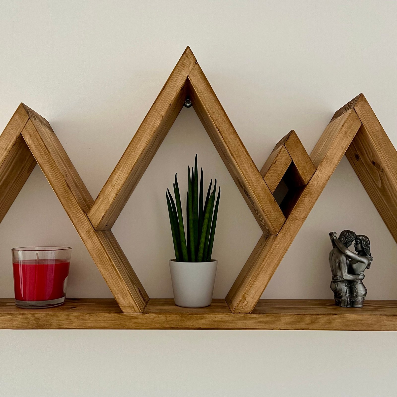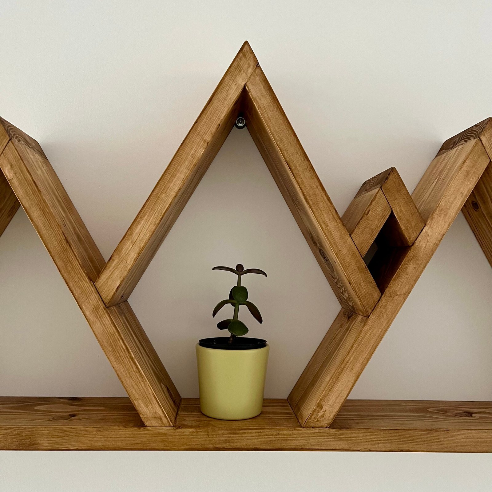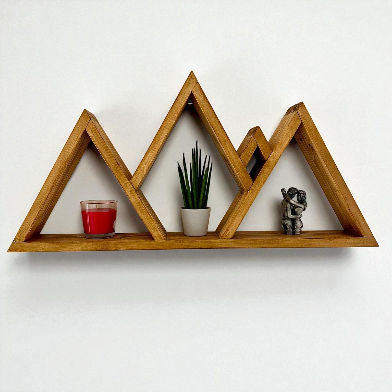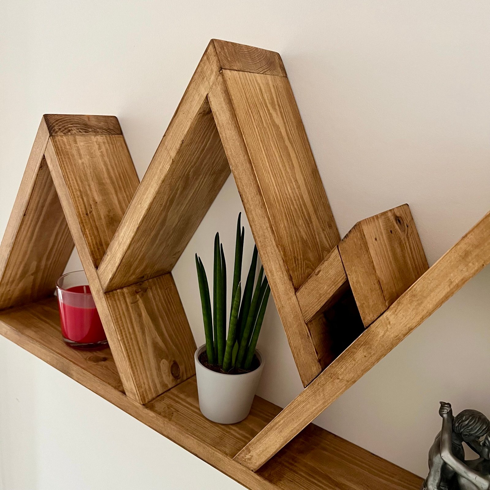 Bring the beauty of the outdoors into your home with this handcrafted wooden mountain shelf. Inspired by mountain landscapes, this unique wall shelf adds rustic charm and natural warmth to any room.